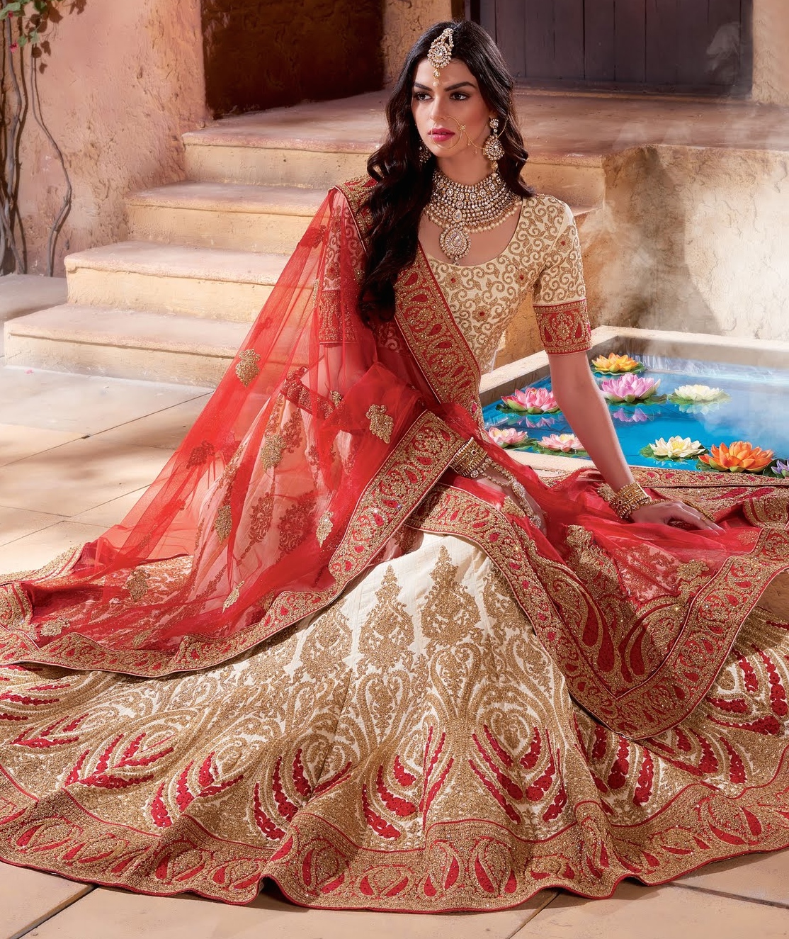 Cream And Red Colour Lehenga